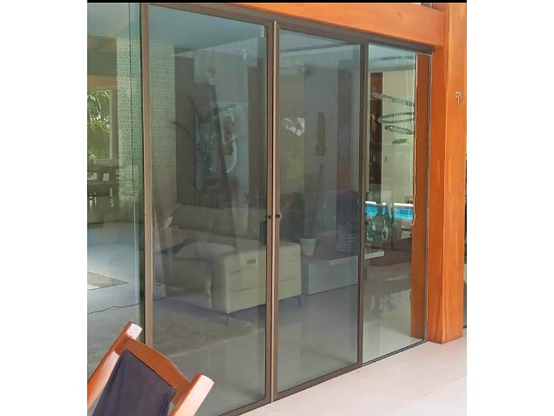 Puerta corrediza. Se desplaza sobre un riel, lo que permite abrirla y cerrarla deslizándola a un lado. El marco de la puerta tiene un color similar al de la madera, la puerta cuenta con paneles de vidrio, lo que permite el paso de la luz natural y ofrece una vista clara hacia el exterior.