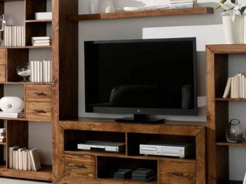 Una mesa de TV de madera es un mueble generalmente más simple y compacto diseñado para sostener la televisión y posiblemente algunos dispositivos multimedia, como reproductores de DVD o consolas de videojuegos. Por lo general, no incluye tanto espacio de almacenamiento como un centro de entretenimiento más grande y se centra en brindar un soporte estable para la televisión, a menudo con uno o dos estantes inferiores para componentes adicionales