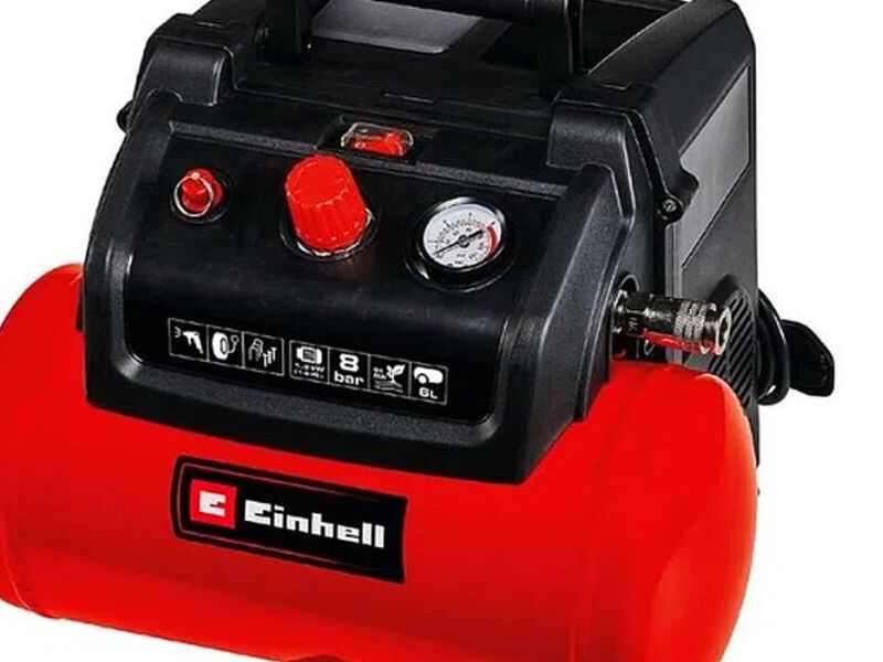 El compresor Einhell TC-AC 190/6/8 OF Set es un verdadero todoterreno para los diferentes trabajos en el hogar, el taller y el garaje. Con las herramientas adecuadas, el compresor se puede utilizar para una gran cantidad de aplicaciones: desde pintar y aplicar aceite hasta trabajos de soplado y limpieza. Llena neumáticos, pelotas y colchones con aire en muy poco tiempo. El motor sin aceite y sin mantenimiento requiere poco mantenimiento. El compresor móvil tiene un tanque de aire comprimido de seis litros para proporcionar reservas suficientes para trabajos prolongados. Hay un práctico enrollador de cable en la parte posterior de la carcasa.