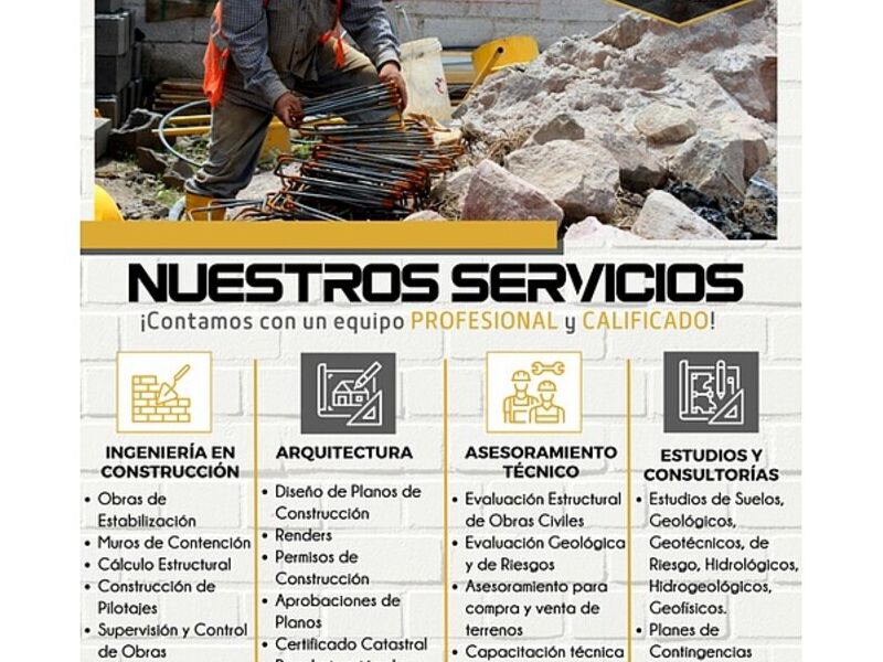 Obras de estabilización, muros de contención, cálculo estructural, construcción de pilotajes, supervisión y control de obras, excavaciones y movimiento de tierra, casas y edificios, diseño de obras civiles.
