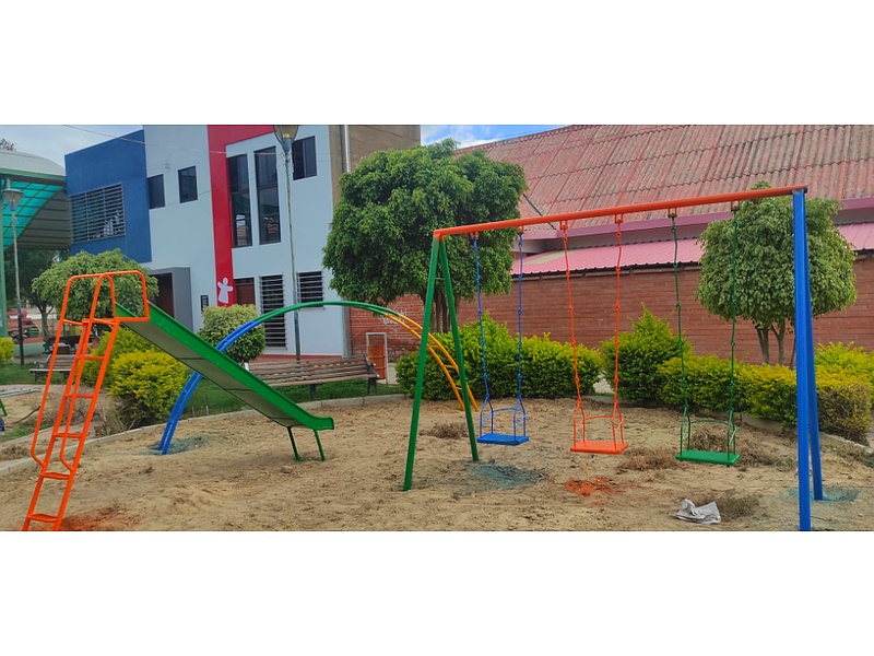 Las estructuras del parque infantil está compuesta por elementos metálicos tubulares, pintados en colores llamativos, están bien ancladas al suelo, los materiales utilizados son resistentes y duraderos, lo que indica que se han tomado medidas de seguridad adecuadas.