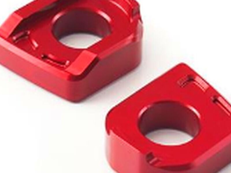 Los bloques de ajuste de cadena Triumph están mecanizados y ofrecen un elegante reemplazo rojo para los ajustadores originales.