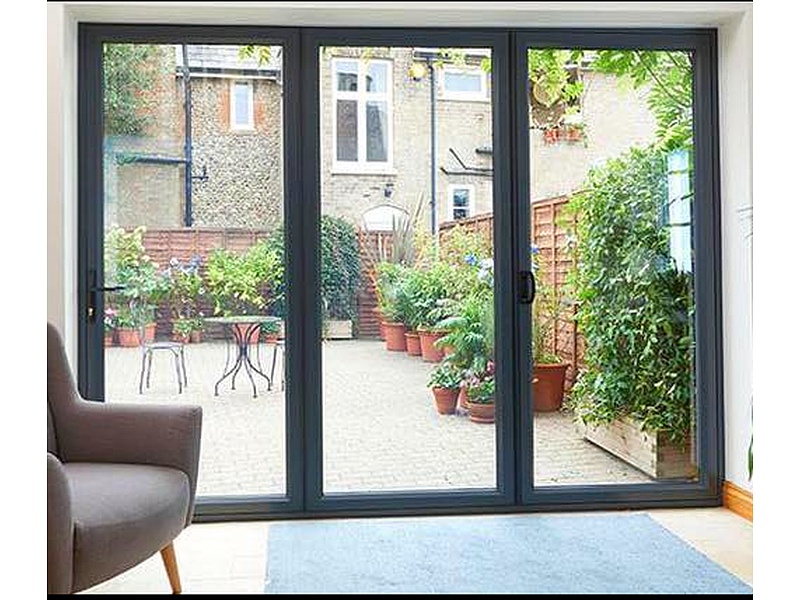 Puerta plegable de aluminio que ofrece una transición fluida entre el interior y el exterior de una vivienda, este material es ligero, resistente a la corrosión y muy duradero, lo que lo convierte en una excelente opción para puertas exteriores.