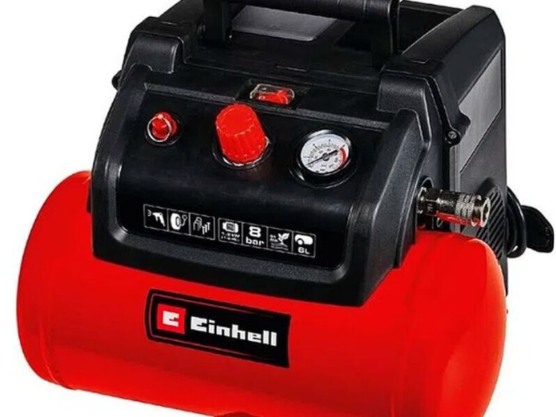 El compresor Einhell TC-AC 190/6/8 OF Set es un verdadero todoterreno para los diferentes trabajos en el hogar, el taller y el garaje. Con las herramientas adecuadas, el compresor se puede utilizar para una gran cantidad de aplicaciones: desde pintar y aplicar aceite hasta trabajos de soplado y limpieza. Llena neumáticos, pelotas y colchones con aire en muy poco tiempo. El motor sin aceite y sin mantenimiento requiere poco mantenimiento. El compresor móvil tiene un tanque de aire comprimido de seis litros para proporcionar reservas suficientes para trabajos prolongados. Hay un práctico enrollador de cable en la parte posterior de la carcasa.