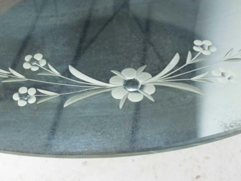Tableros de mesa de vidrio con grabados florales.