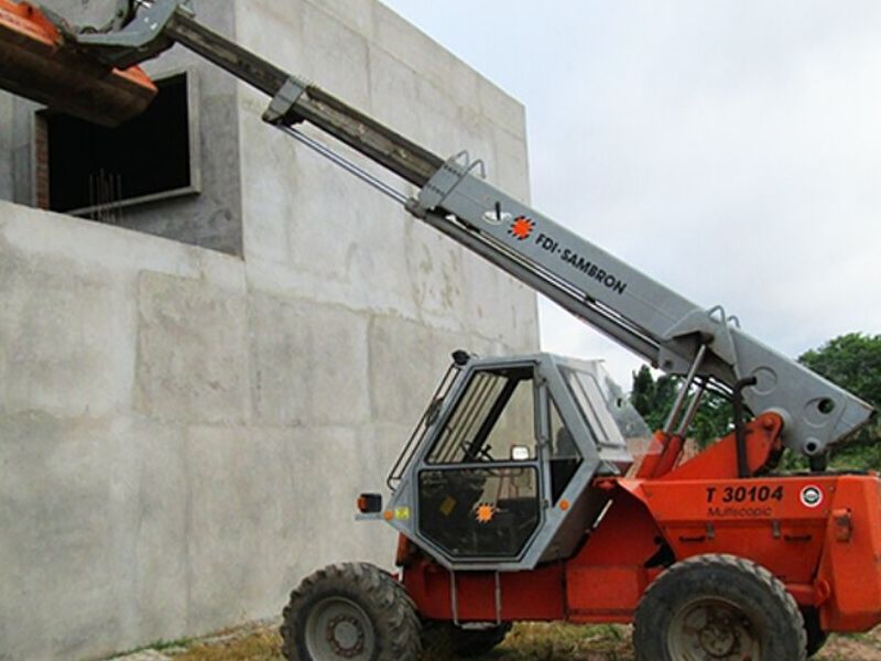 Modelo sambron, de fabricación francesa, Motor perkin a diesel, Extecion máxima de brazo 15 m., Capacidad máxima de carga 3.5 tonelada, Accesorios: pala, pinza y falcón.