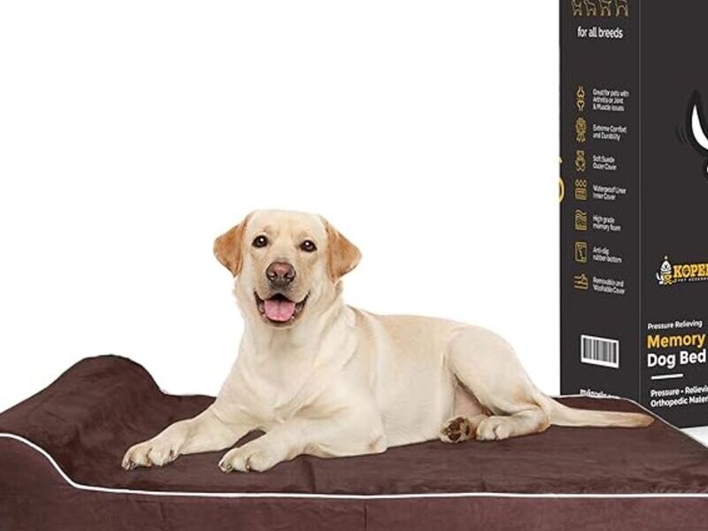 Esta cama jumbo para perros es de 50 pulgadas grande y 34 pulgadas de ancho, hecha de espuma viscoelástica de 7 pulgadas de grosor que alivia la presión sobre las articulaciones y cuenta con un reposacabezas de 3 pulgadas de grosor que soporta la cabeza del perro, para una comodidad óptima.