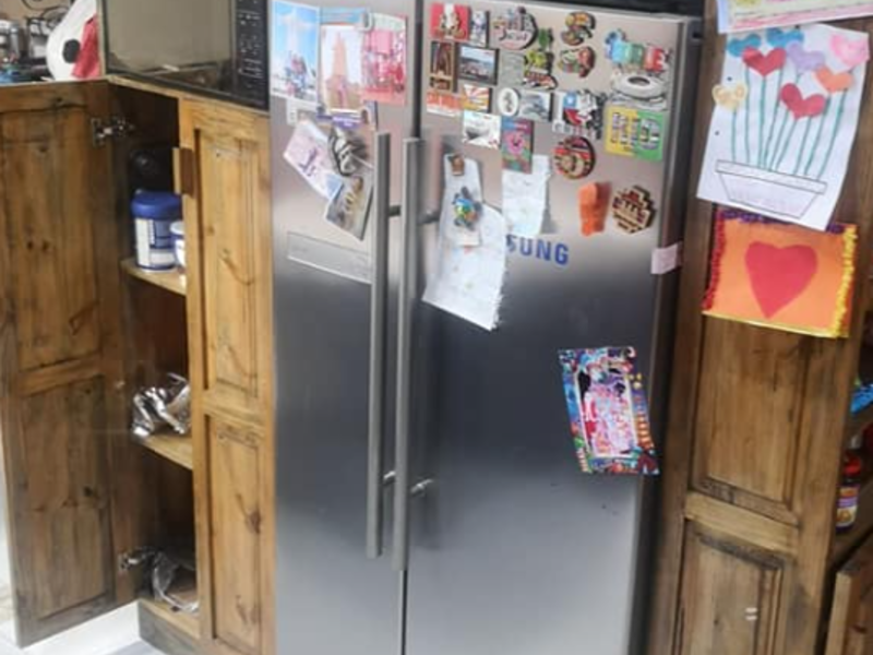 Mueble para cubrir el refrigerador en madera pino, barnizado en envejecido.