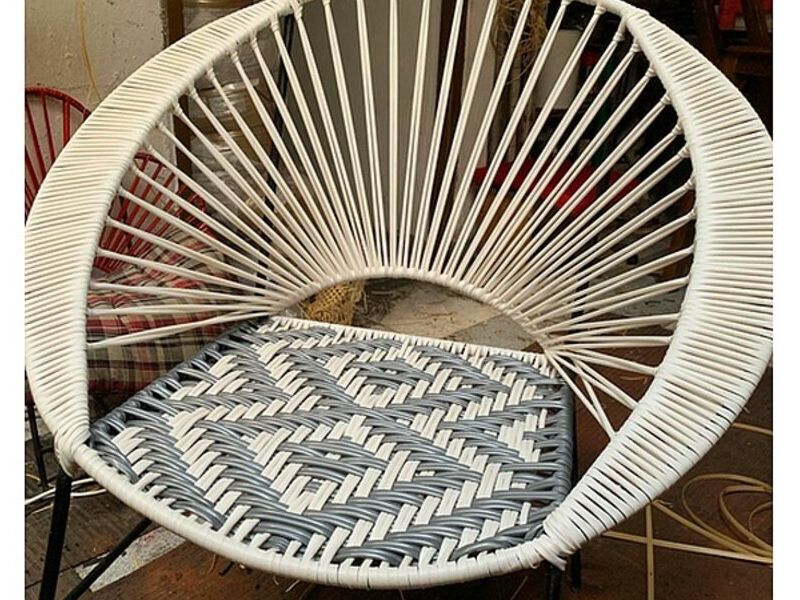 Silla tejida en mimbre plástico blanco y gris.