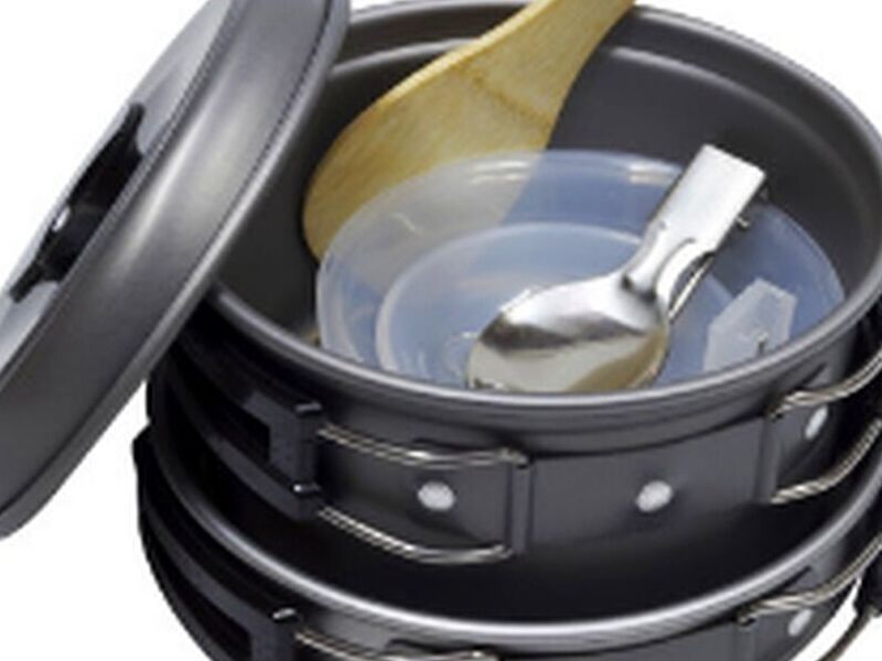 Set de ollas compactas JINX el cual está diseñado para una o dos personas. Tanto la olla como la sartén tienen asas plegables para ahorrar espacio.