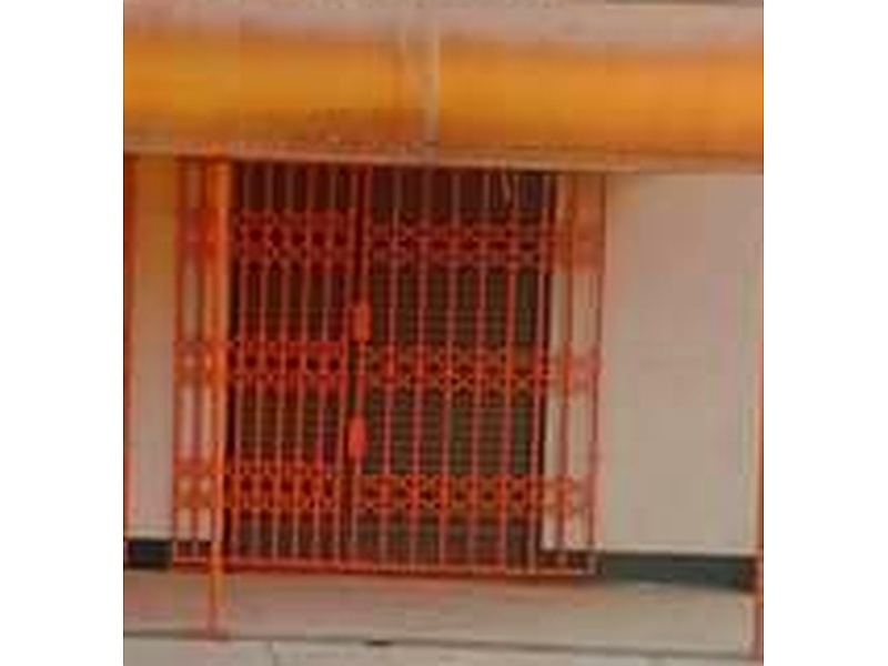 Puerta de seguridad de hierro con un diseño sencillo y funcional. Su color naranja la hace visible y llamativa, y sus perforaciones permiten la ventilación y la entrada de luz, al tiempo que ofrecen seguridad. Este tipo de puertas son comunes en establecimientos comerciales y residenciales que requieren una protección básica contra robos e intrusiones.