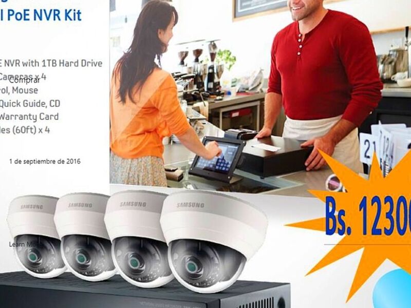 Kit de vigilancia de video IP de la marca LOGAN, modelo SRK-3040S. Este kit incluye un NVR PoE de 4 canales con un disco duro de 1TB, 4 cámaras modelo SND-L6013R, un control remoto, un mouse, un manual de usuario, una guía rápida en CD, un cable de alimentación, una tarjeta de garantía y 4 cables Ethernet de 60 pies. El precio indicado en la imagen es de Bs. 12300.