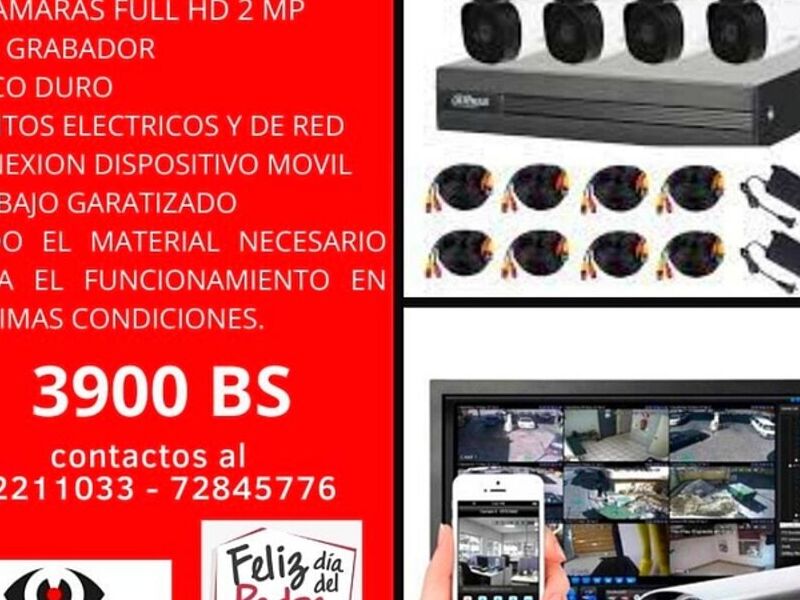 Kit de cámaras de seguridad en Santa Cruz. El kit incluye 8 cámaras de 2 megapíxeles, un grabador XVR, un disco duro de 1TB, y la instalación está incluida. El costo es de 3900 bs.
